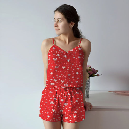 Snowman On Red Background Cami Pajama Set For Women | Pyjamas Short Set | Short PJS Set | Women Tank Top and Shorts Sleepwear Set