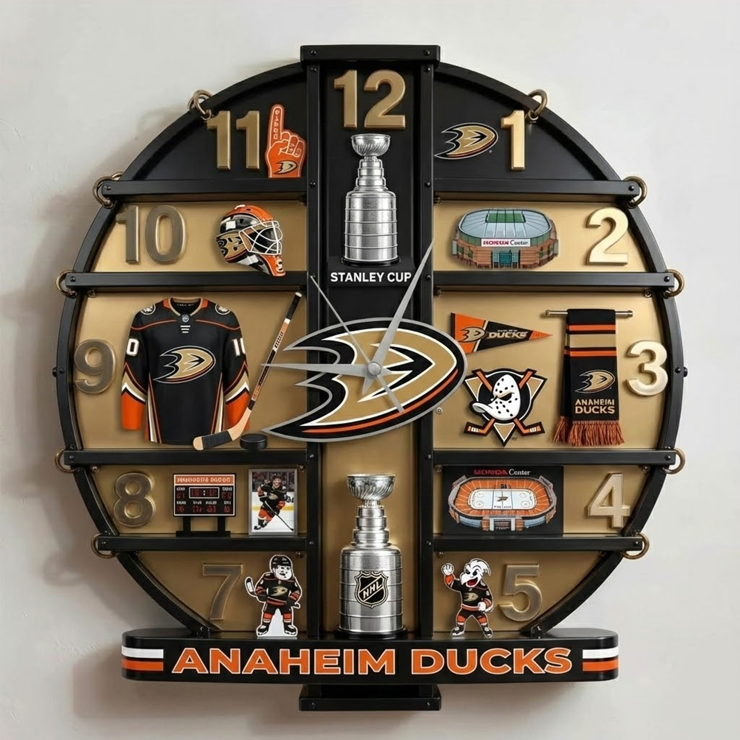 Decorative wall clock designed for sports fans, combining bold style and team spirit. Featuring a 3D visual effect design (flat, single-piece construction), this clock creates depth through printed and sculpted details rather than layered or cast materials.
